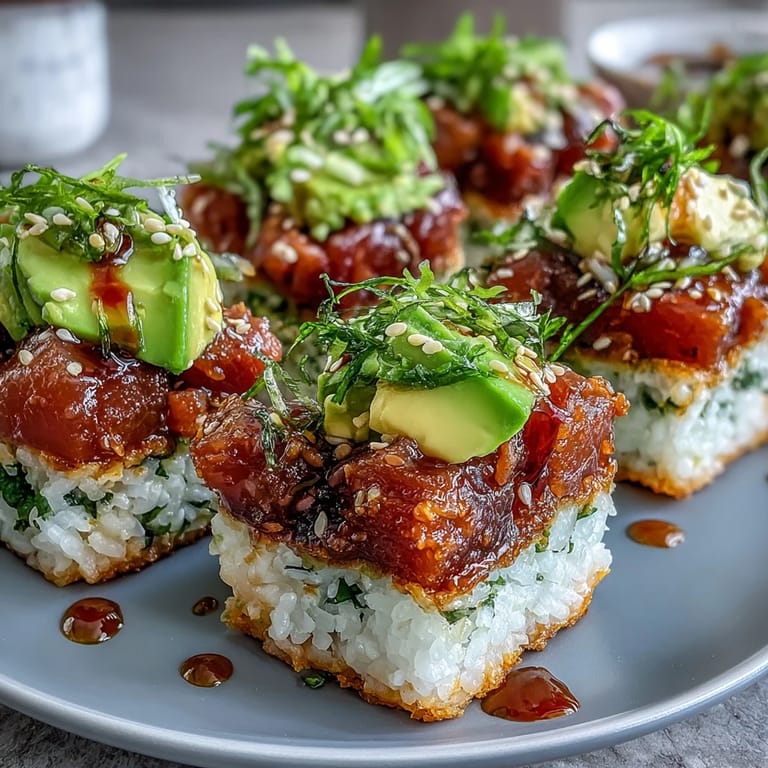 If you want those rice squares at peak crispness, fry them right before serving and assemble shortly thereafter to keep the textures singing. Any extra spicy tuna will keep in the fridge for a day or so (chill it right away!), but the avocado is best used fresh to avoid browning. For an extra flourish, sprinkle with a little flaky sea salt and a touch more sesame oil just before digging in.