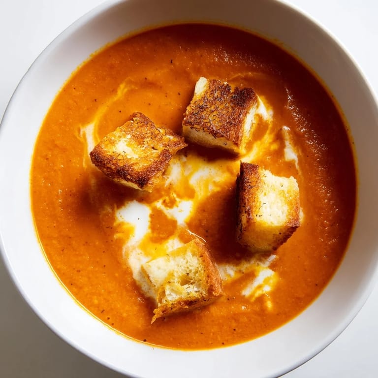 I've added roasted red bell peppers to the tomatoes for a slightly sweeter, smokier soup that my husband loves. A handful of fresh basil stirred in at the end brightens everything up, especially in summer when basil is everywhere. For the croutons, I've used Gruyère and sourdough bread, which made them taste fancier without any extra work. Once I ran out of bread and used thick crackers with cheese melted on top, it wasn't the same but it worked in a pinch.