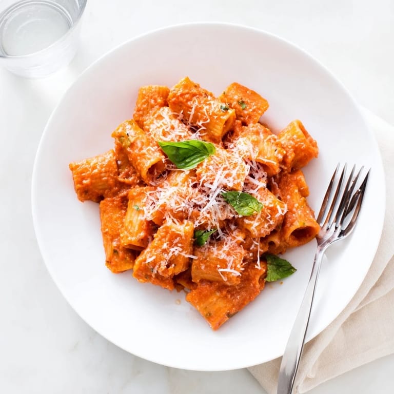 Save The smell of garlic hitting hot olive oil always pulls me back into the kitchen, no matter where my mind has wandered. I made this rigatoni on a Tuesday night when I had nothing planned and even less energy, but somehow the act of stirring cream into tomato sauce felt like a small reset. The heat from the red pepper flakes crept up slowly, just enough to make me pause between bites. It wasn't fancy, but it filled the apartment with warmth and made me feel like I'd done something right. Sometimes that's all you need from dinner.